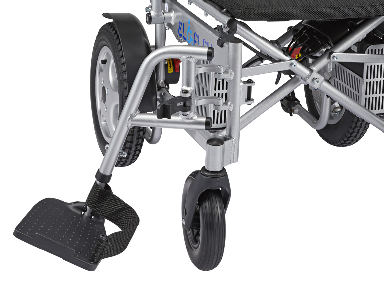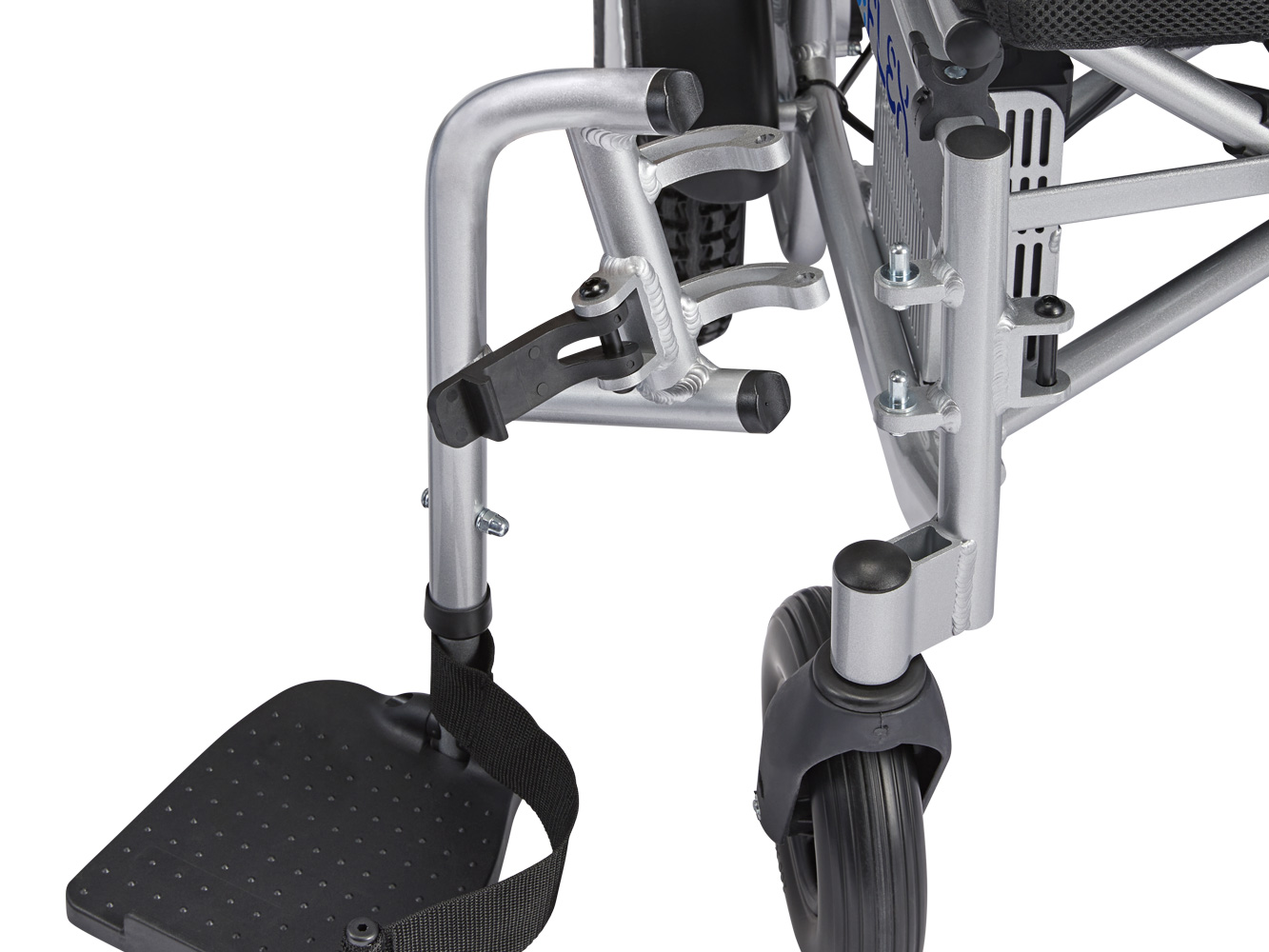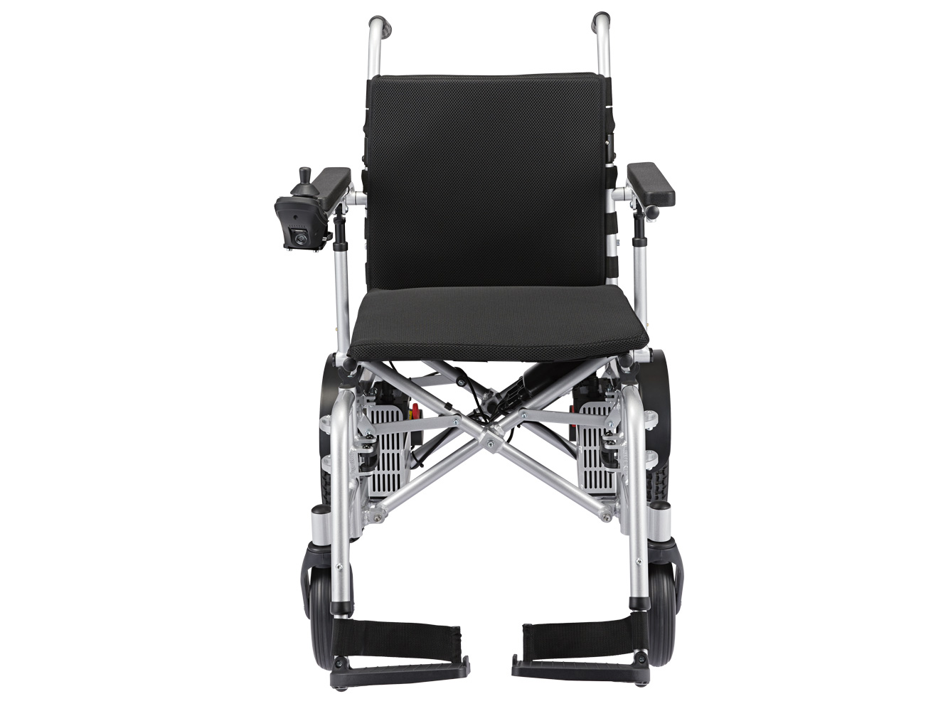 Modell X är utrustad med vanliga uppfällbara fotplattor och fotstöden kan dessutom svängas ut eller enkelt tas bort för smidig i och urstigning. Ryggstödet på modell X kan justeras med olika lutningar vilket är extra viktigt för de som sitter länge och ofta i stolen. Armstöden kan monteras i två olika höjder.