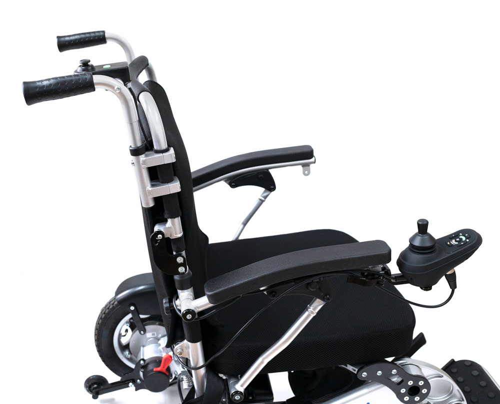 Du väljer själv om kitet ska sitta på höger eller vänster sida. Tumjoysticken drivs av elrullstolens ordinarie battierer och kontrollbox, du behöver därför inte ladda den. Den drar inte mer batteri att använda så din Eloflex behåller sin långa körsträcka. Den totala vikten på vårdarstyrningskitet inklusive joysticken är 1,5 kg.