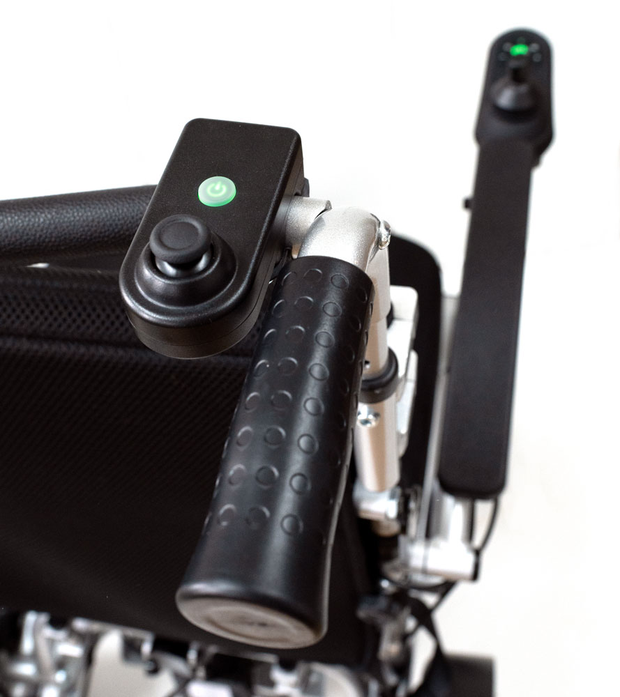 Med denna vårdarstyrning kan joysticken på armstödet fortfarande sitta kvar som vanligt på stolen. På så sätt kan användaren själv ta över styrningen vid behov. Joysticken har även en lampa som lyser upp vägen framför rullstolen, den kan endast användas när man kör utan vårdarstyrningen.