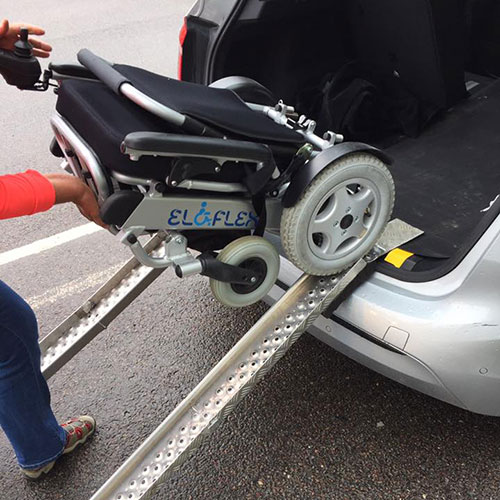 En ramp av något slag är ett bra hjälpmedel för att lasta in en Eloflex i bilen. Det här sättet är extra effektivt för dig som inte orkar lyfta tungt. Du kan till och med köra upp din Eloflex för rampen i hopfällt läge med hjälp av stolens motorer. Det finns många olika typer av ramper; långa, korta, breda och smala… Eloflex säljer två olika modeller och du finner dem under tillbehör. På bilden presenterar vi en lösning som en av våra användare skickat till oss och som fungerar mycket bra för dem.