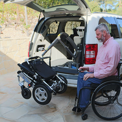 En smidig, men lite dyrare lösning är att installera en kran i bilens bagageutrymme och med hjälp av den lyfta in din Eloflex i bilen. Det här är bästa lösningen för dig som sitter i rullstol och som vill kunna ta med din Eloflex i bilen på egen hand. Det finns en uppsjö olika lösningar och modeller på marknaden men med tanke på Eloflexens låga vikt räcker det ofta med en ganska enkel kran. Vi föreslår att du vänder dig till ditt närmaste bilanpassningsföretag för mer information.