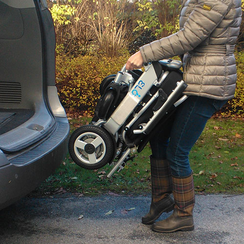 Lägre grepp för den som är kortare. På detta sätt kan du utnyttja hjulen och rulla in stolen i bagaget när du lyft upp den till kofångarens höjd. Glöm inte att frikoppla motorerna innan du lyfter.