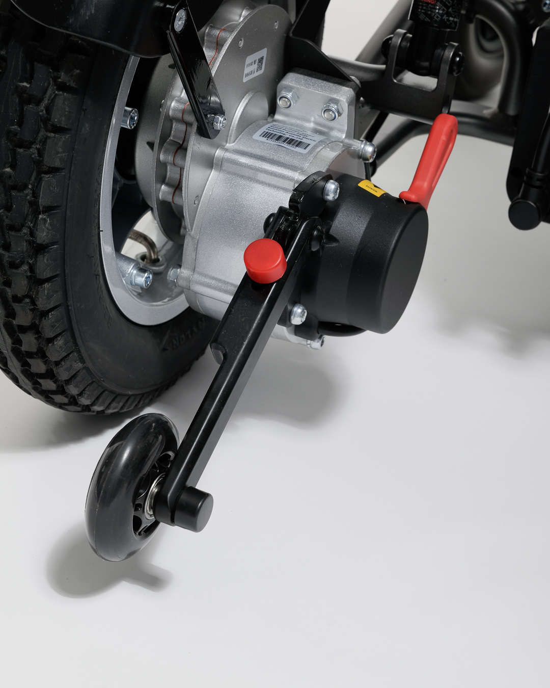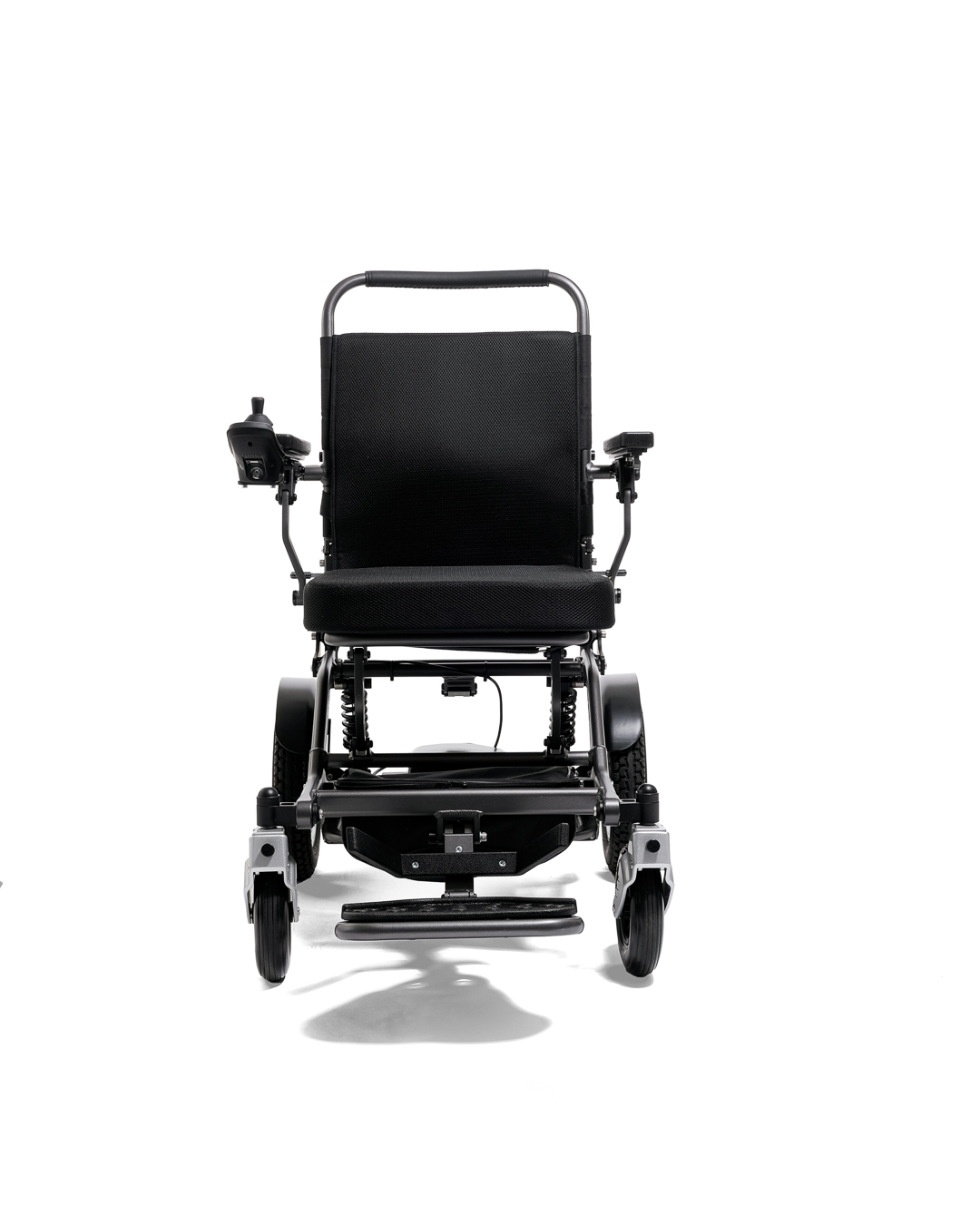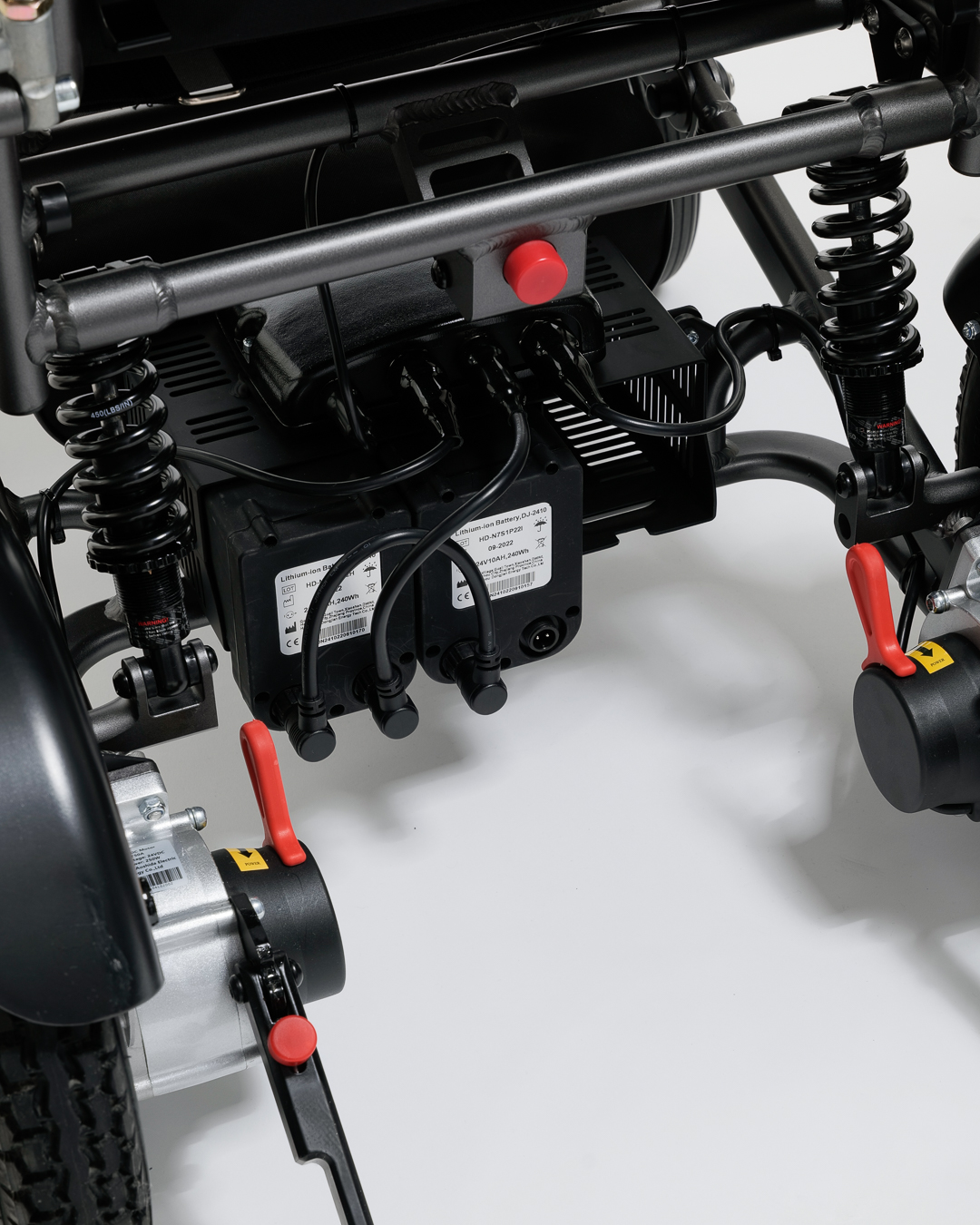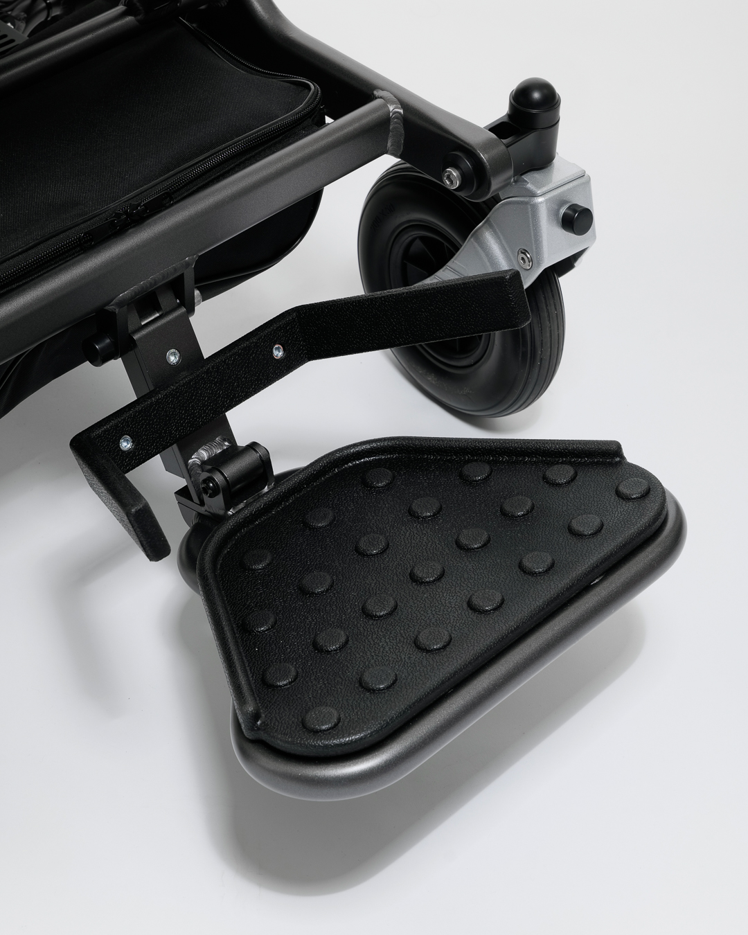 Säädettävät käsinojat ja jalkatuet mahdollistavat yksilöllisemmän istuvuuden ja vahvistavat mallin mukavuuden korostamista. Kolmella akkuosastolla varustettu malli tarjoaa pidemmän käyttöajan pidemmille matkoille. Kun se on taitettuna, käytännöllinen turvalukko pitää pyörätuolin lukittuna taitetussa asennossa, mikä tekee kuljetuksesta ja säilytyksestä helppoa.